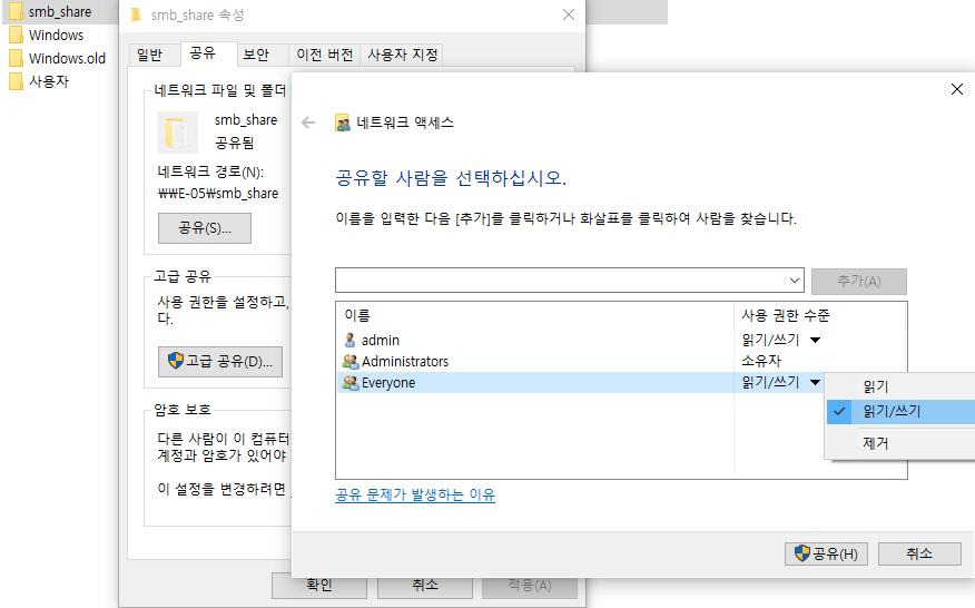 공유할 폴더 오른쪽 클릭 -> 속성 -> 공유 탭 -> 공유(S)...