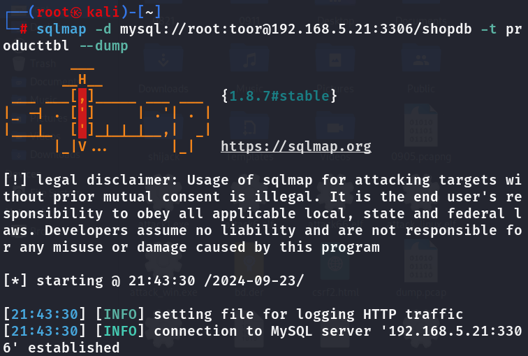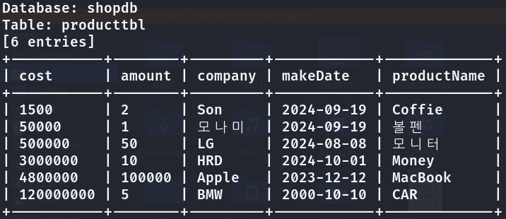 sqlmap -d mysql://아이디:암호@아이피:포트번호/DB이름