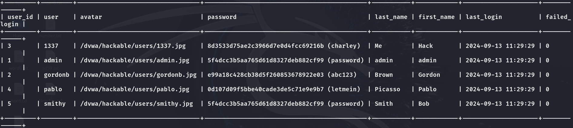 ▶ dvwa 데이터베이스 내의 users 테이블 내의 모든 데이터를 가져오는 명령어
